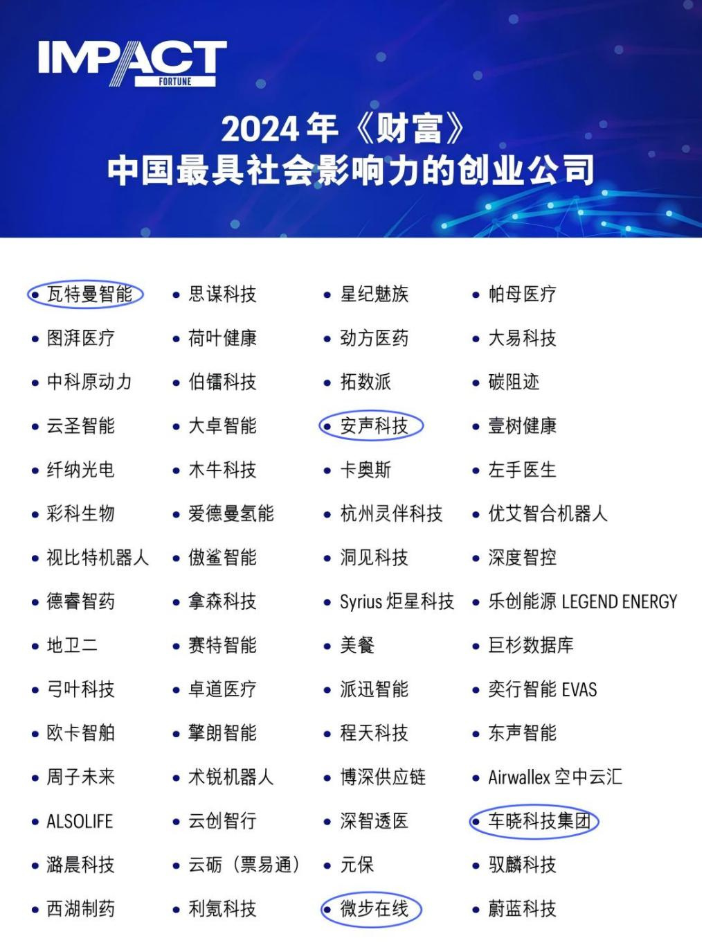 近日,全球著名商業(yè)雜志《財(cái)富》(Fortune Magazine)發(fā)布“2024年中國最具社會(huì)影響力的創(chuàng)業(yè)公司”榜單。創(chuàng)投集團(tuán)4家被投企業(yè)成功上榜,包括:瓦特曼智能、安聲科技、微步在線和車曉科技。